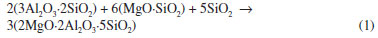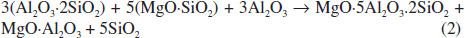 A Equaçao 2 apresenta uma proposta da reaçao concorrente à formaçao de cordierita-α, em baixas temperaturas (até 1250 ºC), que aconteceria no caso da formulaçao em estudo. Nesta reaçao, a mulita proveniente do caulim, juntamente com a enstatita formada a partir do talco, reage preferencialmente com a alumina-α, formando como produtos de reaçao a safirina, o espinélio e a cristobalita (forma alotrópica da sílica estável a altas temperaturas).