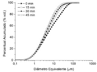 ![]() Figura 1. Distribuiçoes granulométricas acumuladas das formulaçoes para os diversos tempos de moagem e para a formulaçao sem moagem