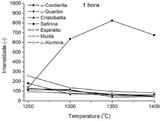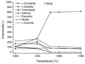 ![]() Figura 4. Intensidades dos picos de raios X das fases presentes nas amostras da formulaçao in natura tratadas por 1 h em funçao da temperatura de tratamento