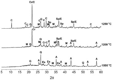 ![]() Figura 6. Difratogramas de raios X das amostras da formulaçao moída por 45 min, tratadas por uma hora, em funçao da temperatura de tratamento. A: α-alumina; C: α-cordierita; Cr: cristobalita; E: Espinélio; Es: enstatita; M: mulita; Q: α-quartzo; Sp: safirina