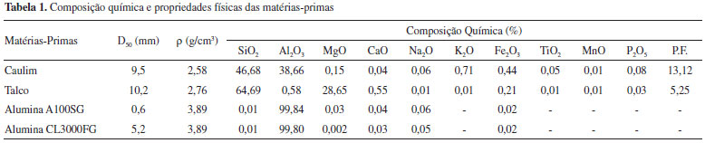 PARTE EXPERIMENTAL A cordierita é constituída por 13,8% de MgO, 34,9% de Al2O3 e 51,4% de SiO2, em massa. As matérias primas empregadas neste trabalho foram: caulim e talco (ambos fornecidos por Colorminas, Brasil) e alumina (uma mistura de 85% em massa de 1000SG, como alumina fina, e 15% em massa de CL3000FG, como alumina grosseira, ambas fornecidas por Alcoa, EUA). Para se obter uma formulaçao estequiométrica da fase cordierita os componentes foram misturados nas proporçoes em massa de 40,0% caulim, 43,8% talco e 16,2% alumina. As matérias-primas foram caracterizadas por meio de análise granulométrica (Mastersizer S, Malvern, Inglaterra) e de medidas de densidade em picnômetro de He (Accupyc 1330, Micromeritics, EUA). As análises químicas foram obtidas por meio de fluorescência de raios X (Philips PW 2400, Holanda). Algumas propriedades físicas e a composiçao química das matérias-primas sao apresentadas na Tabela 1.