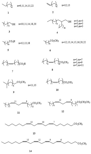 RESULTS AND DISCUSSION Chemical analysis Each box of culture broth (1.2 L) yielded 38.71-49.67 g of fresh mycelia, corresponding to 3.75-5.42 g of dry matter. The total wet mass of mycelia resulting from the sum of yields was 888.34 g, which produced 89.9 g of dry matter after IR desiccation. The crude extract was obtained by maceration in CH2Cl2 (x3,24 h) and CH3OH (x3,24 h) at room temperature. After filtration, evaporation, and vacuum desiccation, 14.8 g of brown oil was obtained. The whole extract was fractionated by polarity in a liquid-liquid extraction system, according to a modified version of the Kupchan method.27 The process flow diagram can be found in supplementary material (Figure 2S). Each fraction was screened using chromatography (column chromatography, size-exclusion chromatography, and thin-layer chromatography) and analyzed using GC-MS (for volatile compounds) or spectroscopy (NMR, MS, and IR), allowing the identification of the following categories of compounds: Volatile organic compounds Volatile organic compounds, i.e., compounds that volatilize in gas chromatograph injector at temperatures of 270 ºC, were identified by GC-MS (Table 1) and classified by structural criteria (Figures 1-3) as follows: n-alkanes (1); 1-alkenes (2); 1-alkanols (3); 2-alkyl-1-alkanols (4); saturated (5) and unsaturated (7) free fatty acids; fatty acid amides (10); saturated (6) and unsaturated (8,11-14) fatty acid methyl and ethyl esters; unsaturated triglycerides (15) and diglycerides (16); unsaturated monoglycerides (17); wax esters (19 and 20); lipid catabolites (21 and 22); mono-, sesqui-, and straight-chain terpenes (23-25); and an aromatic hydrocarbon from the shikimic acid route (26).