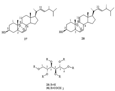 Triolein (15) was obtained from one of the less polar fractions of the mycelia extract as yellowish oil and was identified using IR, 1H-NMR, 13C-NMR, 1H-1H-(COSY, TOCSY, NOESY), DEPT_135, HSQC, HMBC, and mass spectroscopic data. Although several factors may affect either the fatty acid composition or the percentage of total lipids found in fungi,32 fatty acid analysis of the cultured P. roqueforti indicates a limited capacity of lipid accumulation in this strain. However, the characteristic oleic acid as a major constituent of the unsaturated fatty acid fraction (0.4% DW of mycelia) offers functional benefits of oxidative stability and nutritional attributes to this fungus. Another biomolecule that was isolated in its purest form was 5α, 8α-epidioxyergosta-6,22-dien-3β-ol (27) usually denominated ergosterol peroxide (EP). The product, which crystallizes from methanol, has a melting point of 178-180 ºC and was identified using IR, 1H-NMR, 13C-NMR, 1H-1H-(COSY, TOCSY, NOESY), DEPT_135, HSQC, HMBC, and mass spectroscopic data (Table 2).