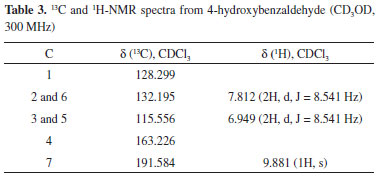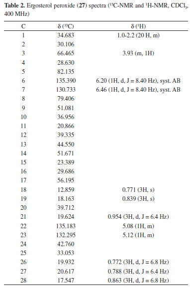 Previous studies have offered contradictory explanations for the origin of sterol peroxides that may be formed by the photo-oxygenation of sterols with double conjugated bonds at C-5/C-6 carbons and at C-7/C-8 carbons.33 Thus, EP in extracts from fungi was regarded as an artifact rather than as a natural product, which was produced by the photo-oxygenation of ergosterol during the experimental procedures or was possibly sensitized by fungal pigments during mycelia growth.34 Although there are no references to the existence of sterol peroxides as biological membrane constituents, enzymatic and photo-oxidative conversions of ergosterol into EP were observed in vivo in Penicillium sp. and Gibberella sp.22 Similarly, Sheikh and Djerassi35 working with a sterol mixture from the marine sponge Tethya aurantia suggested that EP was formed by biological processes. EP is also a major antitumor sterol produced by edible or medicinal mushrooms.36-38 This compound can be either extracted from another filamentous fungal species such as Paecilomyces variotii, 39 P. tenuipes, 40 and P. herquei41 or synthesized from ergosterol by photosensitized oxygenation with eosin.42 The 9(11)-dehydro derivative (28) was not isolated in its purest form, and it was found with the aforementioned EP (27) in the form of a white solid, with a melting point (Mp) of 171 ºC-176 ºC [α]D20 = -9.7 (CHCl3, c 1.2), and was identified using IR, 1H-NMR, 13C-NMR, 1H-1H-(COSY, TOCSY, NOESY), DEPT_135, HSQC, HMBC, and mass spectroscopic data. The 1H-NMR spectrum showed two superimposed AB systems centered at δ 6.41 and 6.48, respectively, with J = 8.7 Hz for both. After consulting the literature, this material was recognized as a mixture of EP and its 9(11)-dehydro derivative.43 The quantitative ratio of these products in the mixture was obtained by integrating the olefinic protons in the AB system NMR spectrum (400 MHz), resulting in a mix of EP (79%) and 9(11)-DHEP (21%), structures 27 and 28, respectively. This quantitative relation was confirmed using the optical rotation method. A graph was then drawn using the experimental values of optical rotation of the mixture versus the percentage of EP. The graph of the optical rotation data provided by Fisch et al.42 and Mediavilla43 (Table 1S in the supplementary material) showed a linear relationship between the value of [α]D and the percentage of EP, where % EP = 70 - 0.91 x [α]D By introducing the value [α]D20 = -9.7 into this equation, the optical rotation obtained for this material was 78.8% for EP, which was consistent with the 79.0% optical rotation obtained by integrating the 1H-NMR spectrum. Finally, it should be noted that in the 13C-NMR spectrum of this mixture, six small signs of olefinic carbons can be detected from the DHEP, with the signals assigned relevant for C-9 carbon at δ 130.970 (δ 51.081 in EP) and C-11 carbon at δ 125.00 (δ 20.866 in EP). Moreover, the 1H-NMR spectrum of this mixture gives a signal at δ 5.48 (0.21 H, m) that has been assigned to vinyl proton on C-11 carbon. Another non-volatile compound, 4-hydroxybenzaldehyde (26), was obtained pure by crystallization of methanol (Mp = 121-122 ºC). Its structure was elucidated from its spectroscopic data, mainly NMR spectroscopy (Table 3).