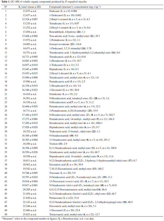CONCLUSIONS In all, 50 volatile compounds were identified in the P. roqueforti mycelia, which included n-alkanes; 1-alkenes; 1-alkanols; 2-alkyl-1-alkanols; saturated and unsaturated free fatty acids; fatty acid amides; saturated and unsaturated fatty acid methyl and ethyl esters; unsaturated triglycerides and diglycerides; unsaturated monoglycerides; wax esters; lipid catabolites; mono-, sesqui-, and straight-chain terpenes; and an aromatic hydrocarbon from the shikimic acid route. Five non-volatile compounds were identified, which have been described in P. roqueforti for the first time, namely, triolein, ergosterol peroxide, 9(11)-DEPH, 4-hydroxybenzaldehyde, and d-mannitol. In summary, an unusual strain of P. roqueforti that did not produce any toxins was found. This study allowed identification of compounds that were already reported in the literature, but it also detected new compounds for this fungus. The cultured strain of P. roqueforti does not contain any component of the volatile chemical components involved in the biogenesis of PR-toxin, which is consistent with the chemical tracers proposed by Demyttenaere et al.,17 Jelen,18 and Calvert et al..19 Moreover, there are no indications the studied strain may produce botryodiplodin, the mycotoxin described by Moreau et al.56 in a P. roqueforti strain that does not produce the PR-toxin. The results of this study support the idea that the metabolic profiles of the mycelia of this P. roqueforti strain can be potentially used as therapeutic agents and natural sources for the production of nutraceuticals and functional foods. Although relatively closely studied, there is no doubt that these halotolerant filamentous fungi still represent an intriguing area of research for the production of new, high-value biomolecules.