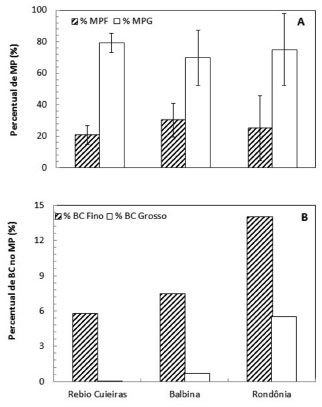 ![]() Figura 3. (A) Percentual de Material Particulado (MP) e (B) Percentual de BC fino e grosso durante a estação chuvosa na Rebio Cuieiras, Balbina e Rondônia