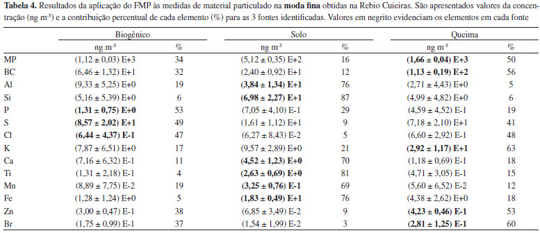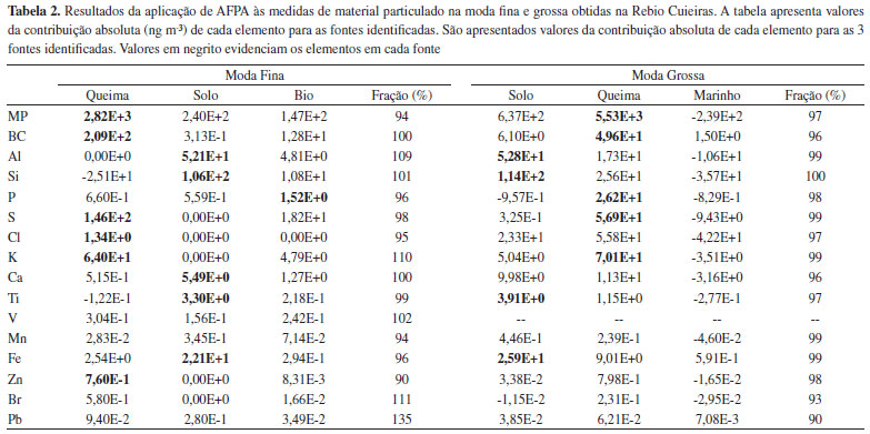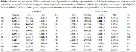 Resultados da análise de fatores principais absoluta - AFPA As bases de dados contendo as medidas das propriedades químicas do material particulado da Rebio Cuieiras e Balbina foram submetidas à análise de fatores principais absoluta. A moda fina na Rebio Cuieiras (Tabela 2) e Balbina (Tabela 3) é composta por três fatores principais, sendo a primeira componente relativa à emissão biogênica com elementos em comum para ambos os sítios, K, S e Zn, com o BC indicando emissão de queimada, que acontece no período de seca na Amazônia (agosto a outubro). Esses elementos são carregados simultaneamente com as plumas de queimadas na região, fazendo com que a floresta receba de regiões circunvizinhas elementos importantes para a ciclagem de nutrientes na Amazônia. A segunda componente refere-se à poeira do solo, com elementos comuns, como Al, Si, Fe e Ca, para moda fina tanto para Rebio Cuieiras como para Balbina. A terceira componente é composta apenas pelo elemento P, traçador importante para caracterização de emissão biogênica de aerossóis.