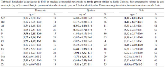 Na moda grossa, para os sítios da Rebio Cuieiras e Balbina na fonte solo, há grande semelhança na contribuição dos elementos Al (8,3 e 8,1%), Si (17,8 e 14,8%), Mn (0,07 e 0,07%) e Fe (4 e 5%), respectivamente, demonstrando a composição homogênea similar entre os sítios de amostragem. O elemento BC contribuiu com (0,96% e 0,90%) na fonte solo e biogênica na Rebio Cuieiras (Figura 5B, 5D) e para Balbina na fonte queimada (Figura 5D) com (1,6%), lembrando-se dos focos de queimadas em maior número para o sitio de Balbina durante o período de coleta de dados. Na fonte biogênica para Rebio Cuieiras e na fonte queimada em Balbina, a contribuição semelhante foi dos elementos P (0,5 e 0,6%), K (1,27 e 1,33%) e o elemento Zn contribuiu com (0,014 e 0,015%). Na Rebio Cuieiras, o elemento S contribuiu nas fontes biogênica (1,03%) e marinha (3,94%), assim como, em Balbina nas fontes queimada (1,86%) e marinha (0,96%). Talvez a presença do S na fonte marinha se deve ao fato de que o dimetil sulfeto biogênico liberado pelo oceano se transforma em sulfato ao longo do transporte atmosférico até Rebio Cuieiras, evidenciando assim a sua presença na fonte marinha. Da mesma forma, os elementos associados com outras fontes apresentaram-se significativos em suas contribuições para a fonte marinha na Rebio Cuieiras e Balbina. Uma possível explicação da presença desses elementos em uma fonte relacionada com transporte marinho é o fato de que ocorre o transporte de massas de ar que carregam consigo esses elementos a distâncias transcontinentais15 e se misturam com o ar carregado de elementos emitidos pela vegetação e elementos traçadores de emissão de poeira do deserto do Saara, por exemplo. Esse transporte foi analisado por meio das retrotrajetórias de massas de ar utilizando o modelo Hysplit. Resultados da fatorização de matriz positiva - FMP A análise por FMP complementa as análises de AFPA, pois o modelo processa apenas valores positivos de concentração atmosférica, assim podemos tirar mais informações da base de dados. As vantagens intrínsecas ao FMP não excluem, no entanto, a necessidade da análise por AFPA. A série temporal da Rebio Cuieiras 2008 foi analisada e 4% das amostras foram retiradas por apresentarem valores extremos (picos com concentrações muito elevadas), os quais o FMP não modela muito bem.28 Para os dados faltantes, o valor da mediana das concentrações medidas para cada elemento substituiu as concentrações faltantes e a incerteza da medida associada foi de 3 vezes o valor da mediana. É aplicado o ajuste dos mínimos quadrados e a relação entre Qteórico e Qatual (Qteórico > 0.70 Qatual) deve ser seguida no FMP,32 expressando que a base de dados foi modelada com o número adequado de fatores. Utilizando-se a base de dados da moda fina, o valor de o Qatual foi 0.73*Qteórico, considerado satisfatório. Na moda grossa o Qatual foi 0.93*Qteórico. Incerteza extra de 20% foi adicionada no processo antes de processar o modelo FMP. As rotações induzidas pelo Fpeak são rotações aproximadas, as quais mudam o valor do ajuste Q. Consequentemente, a menor diferença (dQ) entre QRobusto e QVerdadeiro deve ser considerada. QRobusto representa o ajuste realizado para todos os dados e QVerdadeiro, o ajuste sem valores atípicos. O Fpeak de 0.1 foi utilizado para as modas fina e grossa. Os fatores encontrados pelo FMP para a moda grossa (Tabela 5) foram os mesmos encontrados na aplicação da AFPA: (1) Transporte, elemento Cl; (2) Biogênico+BC, com CPM, BC, P, S, K e Zn; (3) Solo, com os elementos Al, Si, Ca, ti, Mn e Fe. Na moda fina (Tabela 4), os fatores discriminados foram: componente biogênica, caracterizada pelos elementos P, S e Cl. A segunda componente constitui-se em partículas originadas de solo, com os elementos Al, Si, Ca, Ti, Mn e Fe. A última componente caracteriza-se por aerossóis biogênicos com contribuições de BC, com os elementos mais marcantes BC, P, S, Cl e K.