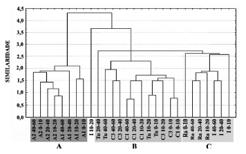 Os solos com maiores teores de matéria orgânica apresentaram as maiores concentrações de espécies metálicas, sendo que os teores de matéria orgânica diminuíram em função da profundidade, perfil esperado para a maioria dos solos. Dessa forma, as concentrações de espécies metálicas também diminuíram em função da profundidade. A razão C/N é um indicativo do grau de humificação da matéria orgânica presente em solos e sedimentos.19 Os valores das razões C/N variaram entre 8 e 29, indicando diferença significativa no grau de humificação dos tipos de solos coletados. A porcentagem de argila variando entre 18 e 55% também indica que os solos possuem características estruturais bem distintas como indicado na Tabela 3. Para melhor entendimento dos resultados obtidos foram feitas análises estatísticas multivariadas das amostras (AHA) e seus parâmetros estudados, bem como uma análise espacial com base em técnicas de geoprocessamento. A análise estatística multivariada dos dados (AHA) feita para as amostras coletadas mostrou que ocorreu a formação de 3 grupos distintos A, B e C (Figura 2).