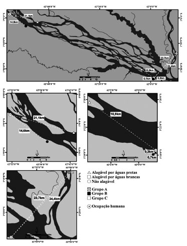 O Grupo B é formado por amostras coletadas em regiões não alagáveis (Tucandera - Tu e Carvoeiro 1 - C1) e pelas amostras coletadas no ponto Carvoeiro 3 (C3), o qual está localizado em região alagável, no entanto é uma região próxima a Carvoeiro 1 (Figura 1). Além de serem regiões semelhantes, possivelmente o agrupamento se deu devido aos menores teores de matéria orgânica desses pontos de coleta, ou mesmo pela proximidade das ocupações humanas locais (Figura 4) da área alagável amostrada, visto que esse ponto de coleta se encontra a 0,3 km de Carvoeiros (C3), assim como os pontos não alagáveis desse agrupamento que se encontram a 0,7 km de Carvoeiros (C1) e a 14,6 km a jusante de Barcelos (Tu).