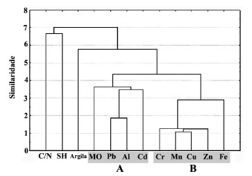 ![]() Figura 4. Dendrograma das variáveis estudadas nas amostras de solos coletados na Bacia do Médio Rio Negro-AL