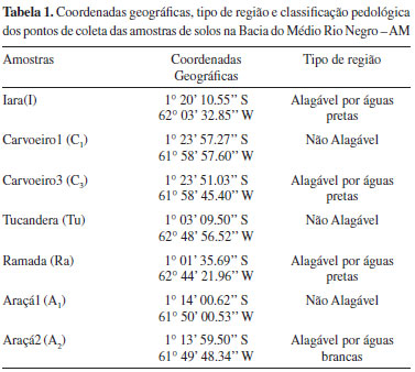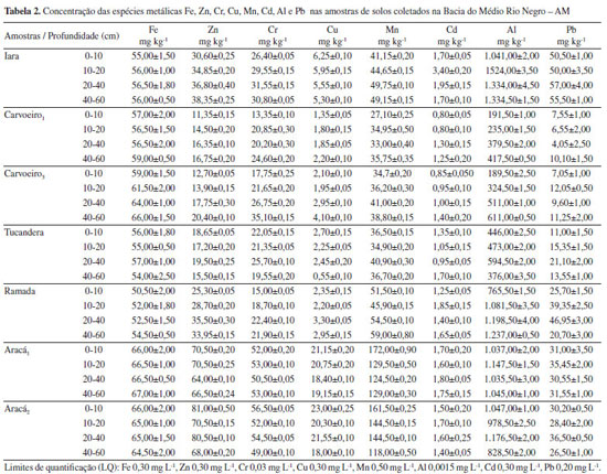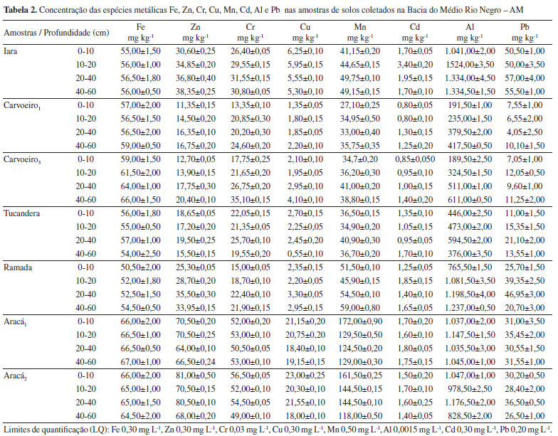 RESULTADOS E DISCUSSÃO As concentrações das espécies metálicas (Fe, Zn, Cr, Cu, Mn, Cd, Al e Pb) determinadas nas amostras de solos coletados na Bacia do Médio Rio Negro - AM (Tabela 2) mostraram que, de maneira geral, as maiores concentrações das espécies metálicas foram obtidas em solos de regiões alagáveis. Provavelmente, isso se deve ao fato que essas regiões ficam submersas durante longos períodos de tempo e, consequentemente, ficam menos disponíveis para que ocorram reações na interface solo/atmosfera, possuindo tempo suficiente para rearranjos intra e/ou intermoleculares das espécies metálicas com complexantes orgânicos naturais presentes nos solos, tais como as substâncias húmicas.