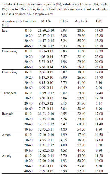 Na Tabela 3 estão apresentados os resultados dos teores de matéria orgânica (%), substâncias húmicas (%), argila (%) e razão C/N em função da profundidade das amostras de solos coletadas na Bacia do Médio Rio Negro - AM.