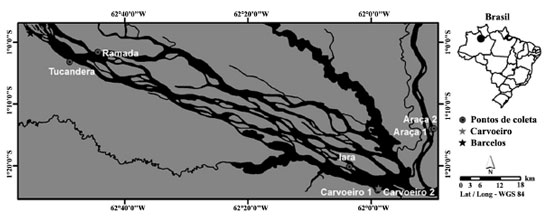 Figura 1. Pontos de coleta de amostras de solos entre a comunidade de Carvoeiro-AM e a cidade de Barcelos-AM, em diferentes tipos de solos de regiões alagáveis e não alagáveis