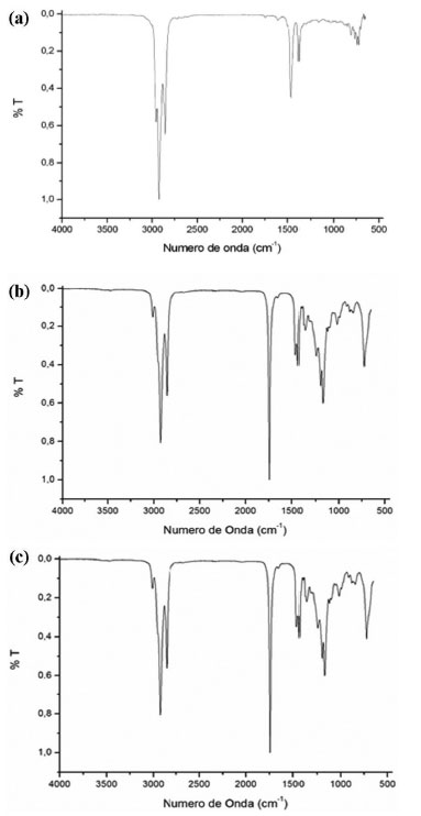 ![]() Figura 2. Conjunto de espectros de infravermelho de óleo diesel S500 (2a), de biodiesel metílico de residual de fritura (2b) e de biodiesel etílico de residual de fritura (2c)