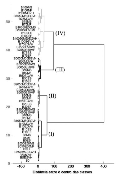 Resultados da HCA e da PCA Para a construção do dendrograma da Figura 4, foi realizado inicialmente um pré-processamento dos dados de espectroscopia por refletância total atenuada no infravermelho com transformada de Fourier (ATR-FTIR). A primeira etapa consistiu na correção da linha de base dos espectros por meio da ferramenta de correção "variação normal padrão" (SNV - Standard Normal Variate) e em seguida os dados foram centrados na média. A HCA dos dados espectrais resultou na formação de 4 grupos distintos. Esses grupos se formaram em função, primeiramente, do aumento do percentual volumétrico de biodiesel presente nas blendas. O primeiro grupo contém as amostras com baixo teor de biodiesel, de 0 a 10%. O segundo grupo é formado pelas amostras com percentual intermediário de biodiesel, igual a 20%. O terceiro e quarto grupos possuem amostras com teores de biodiesel iguais a 50, 75 e 100%. O óleo diesel apresentou semelhança com o primeiro grupo formado pelas amostras de baixo teor de biodiesel, conforme era esperado. O primeiro grupo subdividiu-se em dois subgrupos: as amostras de B5 e de B10. A HCA ainda foi capaz de agrupar as amostras de mesma rota alcoólica de produção do biodiesel, ou seja, separou as metílicas das etílicas de diferentes matérias-primas. O mesmo comportamento foi observado para as amostras B20. No caso das amostras com percentual de biodiesel entre 50 e 100% houve a formação de dois subgrupos. O primeiro subgrupo subdividiu-se em dois outros nos quais foram separadas as blendas de biodiesel etílico de óleo de soja e residual de fritura dos biodieseis de gordura vegetal hidrogenada. O segundo subgrupo subdividiu-se também em dois, de forma que foram agrupadas as blendas produzidas a partir de biodieseis de mesmo teor de biodiesel e mesma rota alcoólica, mas de diferentes fontes de matéria-prima. O último agrupamento também se dividiu em outros dois: o primeiro é formado pelas amostras com teor de biodiesel igual a 50% e o segundo contém amostras com teor de biodiesel de 75 e 100%, todos obtidos por rota metílica de diferentes matérias-primas.
