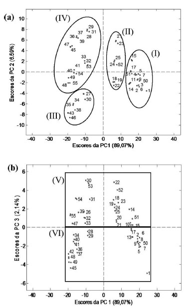 ![]() Figura 5. Gráficos de escores da PCA. PC1 x PC2 (5a) e PC1 x PC3 (5b)