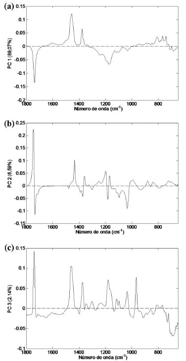 ![]() Figura 6. Gráfico de pesos da PCA. Pesos da PC1 (6a), pesos da PC2 (6b) e pesos da PC3 (6c)
