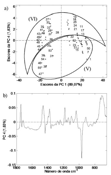 ![]() Figura 7. Gráficos da PCA. Gráfico de escores da PC4 (7a) e gráfico de pesos da PC4 (7b)