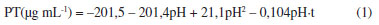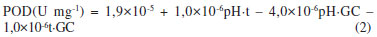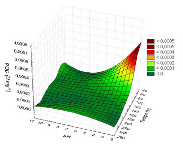 As peroxidases (POD) constituem um grupo de enzimas oxi-redutases que catalisam a redução do peróxido de hidrogênio e a concomitante oxidação de uma variedade de substratos orgânicos e inorgânicos.36,37 A atividade destas enzimas produzidas por microrganismos, em especial fungos, tem sido relacionada com uma grande variedade de processos de interesse biotenológico tais como degradação de poluentes e polímeros vegetais como lignina, entre outros.37 Para a faixa testada, estatisticamente os fatores mencionados não tiveram efeito significativo na produção de POD, embora a análise estatística tenha indicado que existe uma forte interação entre os fatores ao nível de 5%, (p<0,05). Foi observado, conforme a Figura 2, que a produção desta enzima é considerável nas primeiras 90 h da fermentação, no intervalo de pH de 3,0-4,0. A Equação 2 representa o modelo empírico obtido pela análise do planejamento experimental (R2 = 0,752 e ajuste = 0,529). Os parâmetros apresentados são estatisticamente significativos ao nível de 95% de confiança.