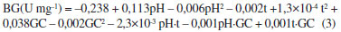 A análise de variância ao nível de 5% indicou que estatisticamente o tempo de contato entre o fungo e a CCA, em solução, foi o fator que mais influenciou a produção de β-glicosidase (p = 0,015), considerando-se o efeito linear. A Equação 3 representa o modelo empírico da produção da β-glicosidase, sendo o coeficiente em negrito estatisticamente significativo ao nível de 95% de confiança, (R2 = 0,673 e ajuste = 0,38).
