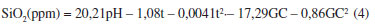 O modelo estatístico de segunda ordem na Equação 4 foi o que apresentou menor erro (R2 = 0,751 e ajuste = 0,527) para a descrição da solubilização da sílica em função dos fatores selecionados e dos níveis tratados. Na Equação 4, são apresentados os parâmetros estatisticamente significativos ao nível de 95% de confiança (p< 0,05).