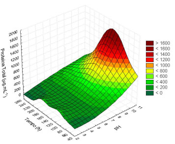 ![]() Figura 1. Modelo de superfície de resposta para produção de proteína total