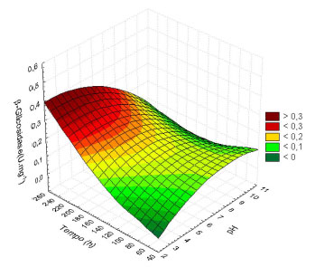 A produção deste tipo de enzima foi maior para concentrações de glicose entre 3 e 9,5 g L-1 para pH 6,5. No entanto, para tempos de reação maiores, quando os nutrientes tornam-se escassos, a produção dessa enzima também foi estimulada. Provavelmente, F. oxysporum secreta este grupo de enzimas para catalisar reações de hidrolise nas quais os carboidratos de mais alta massa molecular presentes no meio de cultura são transformados em glicose, para fornecer energia e manter o metabolismo micelial.38 As β-glicosidases são enzimas envolvidas no metabolismo primário do fungo, tornando-se assim importante monitorar a sua produção ao longo do tempo, visando avaliar o comportamento metabólico do mesmo. Por outro lado, a secreção da β-glicosidase foi altamente dependente do meio de cultivo e do pH.36,39 Para valores de pH ácidos e próximos ao neutro a atividade enzimática exibiu valores elevados para o caso dessa enzima, conforme mostra a Figura 3.