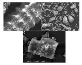 ![]() Figura 5. Micrografias da cinza da casca de arroz: (A) antes e (B) depois do tratamento com Fusarium oxysporum a 28 ºC (pH = 6,5, t = 240 h, GC = 3 g L-1); (C) sílica solubilizada