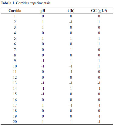 PARTE EXPERIMENTAL A cinza da casca de arroz foi fornecida pela Indústria e Comércio de Arroz Fumacense (Morro da Fumaça, SC, Brasil) com diâmetro médio de ~600 µm. A CCA não sofreu nenhum processamento prévio antes de ser submetida ao processo de biotransformação. Foram utilizados Azul de Comasie Brilliant Blue G-250 e p-nitrofenil-β-D-glicopiranosídeo (PNPG) para a dosagem da concentração de proteínas totais e atividade enzimática, respectivamente, ambos da Sigma-Aldrich; o-dianisidina e peróxido de hidrogênio da Merck; ácido fosfórico (H3PO4), ácido clorídrico (HCl), hidróxido de sódio (NaOH) da Vetec; extrato de malte e glicose anidra da Hymedia. O microrganismo empregado foi o Fusarium oxysporum, fornecido pelo Centro de Estudios e Investigaciones en Biotecnologia (CIBIOT) da Universidad Pontificia Bolivariana (UPB), Medellin, Colômbia. O fungo foi mantido em meio de cultura sólido com extrato de malte e glicose em placas com incubação a 25 ± 1 ºC.30 O meio de cultura foi preparado em frascos erlenmeyer, contendo 15 g L-1 de extrato de malte, 20 g L-1 de cinza da casca de arroz. O pH foi ajustado empregando-se NaOH 0,1 mol L-1 e/ou HCl 0,1 mol L-1. Diferentes concentrações de glicose foram testadas (3, 9,5 e 16 g L-1). Posteriormente, os frascos foram esterilizados em autoclave a 120 ºC, durante 20 min.31 Cada frasco foi inoculado com ~0,5 g (base úmida) de F. oxysporum, em câmara estéril e mantido sob agitação a 200 rpm e a 28 ºC, durante os diferentes tempos estabelecidos no planejamento experimental (48, 144 e 240 h). Foi realizado um planejamento fatorial 23 ampliado (planejamento composto central), fizeram-se testes aleatoriamente para garantir a validade estadística dos resultados, realizando oito pontos do cubo, seis repetições nos pontos centrais do cubo e seis axiais (α = 1), conforme Tabela 1. Os fatores estudados foram: pH, tempo de contato entre o fungo e a cinza da casca de arroz (t) e concentração de glicose (GC) Quando o ponto central é adicionado, estima-se o efeito das interações e a curvatura da superfície de resposta.32