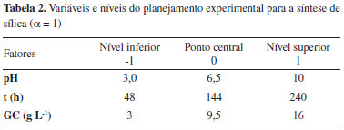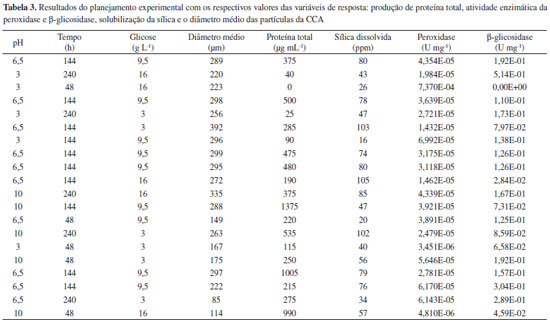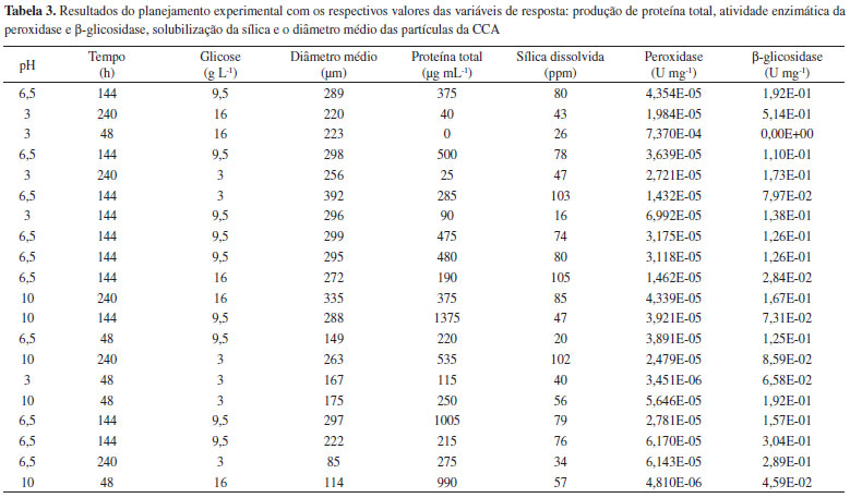 RESULTADOS E DISCUSSÃO A partir do planejamento fatorial foram determinados quais fatores têm efeitos relevantes na resposta e também a avaliação das interações entre eles. Na Tabela 3 são apresentados os resultados obtidos do planejamento experimental. Os fatores estudados neste processo foram selecionados com base no fato bem conhecido de que processos enzimáticos empregados na síntese de materiais metálicos e de diferentes óxidos exigem condições especificas de pH, concentração de nutrientes/substratos, tempo de contato, temperatura, entre outros. Adicionalmente, experimentos preliminares demonstraram que tais fatores influenciam o processo em estudo.30 Essas condições estão diretamente relacionadas não somente à solubilização da sílica no meio aquoso, como também à produção de enzimas extracelulares responsáveis pela hidrólise e redução de diferentes compostos.
