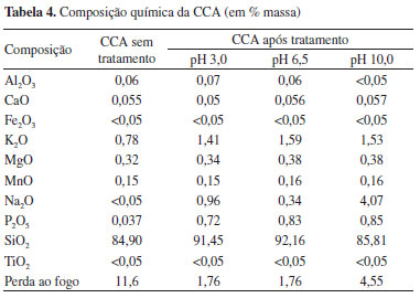 A análise química por FRX foi realizada para amostras submetidas a diferentes níveis de pH, a uma concentração fixa de glicose (3 g L-1), para um tempo de bioprocesso de 240 h. Na Tabela 4 são apresentados os valores dos diferentes elementos presentes na CCA, antes e após solubilização e biotransformação por F. oxysporum, na forma de óxidos.