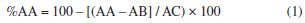 Determination of total phenolic content The total content of phenolic compounds was measured spectrophotometrically using a modified Folin-Denis method.6,7 The honey extract solutions (2.0 mg mL-1 in methanol) were homogenized and 0.5 mL of the extract solution was mixed with 2.5 mL of Folin-Denis reagent. After 5 min, 2 mL of a 14% sodium carbonate (Na2CO3) solution was added. After 2 h of incubation at room temperature, the absorbance of the solution was measured against an ultrapure water blank at 760 nm (UV-Vis spectrophotometer, NI 2000UV Nova Instruments, São Paulo, Brazil). The total phenol content, expressed as milligrams of gallic acid equivalent per 100 milligrams of extract (mg GAE 100 mg-1), was calculated using a calibration curve prepared with gallic acid standard solution (0-0.022 mg mL-1; Y = 4.75098 X + 23.73359; R = 0.99313), which was analyzed in the same way as the extracts. All measurements were performed in triplicate. Determination of total flavonoid content The total flavonoids were evaluated using the method described by Sant'ana et al.7 Briefly, 2 mL of a 2% aluminum trichloride methanolic solution was added to the same volume of honey extract solution (2.0 mg mL-1 in methanol). After 30 min of incubation, the absorbance values were measured at 415 nm against a methanol blank. The total flavonoid content, expressed as milligrams of quercetin equivalent per 100 milligrams of extract (mg QE 100 mg-1), was calculated using a calibration curve prepared with quercetin (0-0.020 mg mL-1; Y = 6.95836 X + 27.0114; R = 0.99296) that was analyzed in the same manner as the extracts. All measurements were performed in triplicate. Determination of antioxidant activity (DPPH. assay) The antioxidant activity of the samples was measured using a DPPH assay using the method of Zang and Hamauzu8 with some modification. In the presence of an antioxidant agent, the purple color of DPPH decays and the change in absorbance is read spectrophotometrically at 517 nm. Seventy-one microliters of honey extract solution (5-100 µg mL-1) or the phenolic standard (5-500 µM) were mixed with 29 µL of 0.3 mM DPPH in methanol.9 A mixture of methanol (29 µL) with honey extract (71 µL) or a standard solution (71 µL) was used as a blank, and a mixture of a DPPH solution (29 µL) with methanol (71 µL) was used as a negative control. After 30 min of incubation at room temperature in a dark place, the absorbance values were measured at 517 nm using an ELISA 680 microplate reader (Bio-Rad, Brazil). The antioxidant activity was calculated as the percentage of DPPH discoloration using equation (1), where %AA = inhibition percentage, AB = average absorption of a blank sample at the end of the reaction, AA = average absorption of a tested honey or phenolic extract at the end of the reaction, and AC = average absorption of a negative control at the end of the reaction,