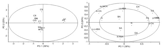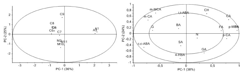 Figure 1. Principal component analysis (left) and loadings graph (right): GA - gallic acid, PA - protocatechuic acid, 4-HBA - 4-hydroxybenzoic acid, p-CA - para-coumaric acid, m-CA - meta-coumaric acid, CA - cinnamic acid, m-MCA - meta-methoxycinnamic acid, ABA - abscisic acid, and CH - chrysin