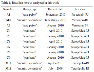 EXPERIMENTAL Honey samples and reagents A total of 11 samples of three Brazilian honey types were used in this study: six samples of "cambara" (Gochnatia spp., Asteraceae) (C4; C5; C6; C7; C8; C9), three samples of "morrão de candeia" (Croton sp., Euphorbiaceae) (M2; M10; M11), and two samples of "assa peixe" (Vernonia spp., Asteraceae) (A1; A3). The samples were harvested in 2009 and 2011 and obtained from different geographical regions of Rio de Janeiro (Table 1) directly from beekeepers, who declared the botanical origins of the samples. The honeys were stored at 4 ºC in the dark until analysis.