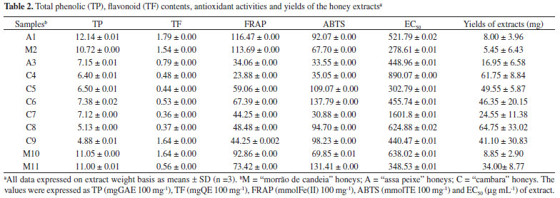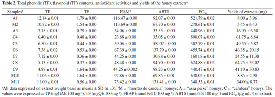 RESULTS AND DISCUSSION Eleven honey extracts of different floral types were evaluated to determine their antioxidant properties and to find possible relationships among total phenolic content, flavonoid content, antioxidant activity, and floral and geographical origins. Total Phenolic Content (TP) and Flavonoid Content (TF) The total content of polyphenolics from different Brazilian honey extracts was investigated using the modified Folin-Denis assay, which is sensitive to phenol and polyphenol entities and other electron-donating antioxidants such as ascorbic acid. The total phenolic contents ranged from 4.88 mg GAE 100 mg-1 to 12.14 mg GAE 100 mg-1 for the extract using a standard curve for gallic acid (R = 0.99985). One of the "assa peixe" samples (A1) had the highest total phenolic content (12.14 mg GAE 100 g-1). The mean values and standard deviations are shown in Table 2. The TP content showed significant differences between the groups. The "cambara" samples had the lowest levels, and the highest levels were measured in "assa peixe" extracts. Variations in total polyphenol content may be caused by different honey sources and storage conditions. The total flavonoid content (TF) was determined using the aluminum chloride method, which is specific to flavones and flavonols. The TF content of extracts was determined using the standard curve generated for quercetin (R = 0.9918). The results are shown in Table 2, and ranged from 0.36 mg QE 100 mg-1 to 1.79 mg QE 100 mg-1. The highest levels were observed for "assa peixe" samples. The levels of phenolic acids are higher than those of flavonoids in these samples. This trend was expected, and was previously observed by Sant'Anna et al.10 and Lianda et al.11 in Brazilian honeys. The results of TF contents obtained for honey extracts were lower than the values previously reported for other Brazilian honeys,11 which ranged from 12.72 to 76.65 mg GAE 100 g-1 and 0.16 to 5.34 mg QE 100 g-1. The values of TP content obtained by Silva et al.12 for Brazilian melipona honey extracts were also higher than those found in this study. The variation in the TP and TF contents among the analyzed honey samples may be caused by variation in the floral sources, because different plants contain different phenolic compounds and show variation in their phenolic contents.4,13 The results of this study agree with those of previous work, which reported a correlation between total phenolic content and antioxidant activity (samples displaying lower phenolic contents also showed lower antioxidant activity).3,12 Total Antioxidant Activity (TAA) Antioxidant activity is the ability of honey to slow oxidative reactions within food systems and the human body.13 The results for antioxidant activity using the DPPH, ABTS, and FRAP methods for different honey extracts are summarized in Table 2. Previous studies have reported that the DPPH, ABTS, and FRAP assays are valid methods to determine the antioxidant properties of food,8,11,14 and the same procedures are also used to evaluate the antioxidant power of honey extracts. The TAA (EC50, FRAP, and ABTS) values were 278.61-1601.8 µg mL-1, 23.88-116.47 mmol Fe(II) 100 g-1, and 30.88-137.79 mmol TE 100 g-1, respectively. The "morrão de candeia" samples showed the highest values for antioxidant activity, and one of the "cambara" samples (C7) was the least reactive species for trapping of free radicals, compared to "assa peixe" and "morrão de candeia" honeys. The values obtained in this study are lower than those reported by Lianda et al.11 for FRAP, ABTS, and EC50 assays (78.51-438.69 mmol Fe(II) 100 g-1, 46.53-383.49 mmol TE 100 g-1, and 5.48-51.45 µg mL-1, respectively) for Brazilian extracts and by Estevinho et al.15 for EC50. One of the "morrão de candeia" samples (M2), showed the highest radical scavenging activity (EC50= 278.61 µg mL-1) and one of the higher TP levels (10.72 mg GAE 100g-1). Sample M2 contained 4-hydroxybenzoic, syringic, and gallic acids (0.010 mg 100 g-1, 0.055 mg 100 g-1, and 0.001 mg 100 g-1 of honey, respectively). Honey extract C7, with one of the lower antioxidant capacities (EC50 = 890.07 mg mL-1), contained two compounds with low antioxidant activity (Table 4): naringenin (EC50 > 5000 µg mL-1) and meta-coumaric acid (EC50 > 15000 µg mL-1).