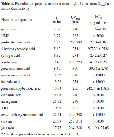 Methanol and HPLC grade acetic acid, aluminum chloride hexahydrate, potassium persulfate, and benzoic acid were purchased from VETEC (Rio de Janeiro, Brazil). The reagents TPTZ (2,4,6-tripyridyl-1,3,5-triazine), TROLOX (6-hydroxy-2,5,7,8-tetramethylchroman-2-carboxylic acid), DPPH (1,1-diphenyl-1-picrylhydrazyl), ABTS [2,2'-azino-bis-(3-ethylbenzothiazoline-6-sulfonic acid) diammonium salt], Folin-Denis reagent, gallic acid, protocatechuic acid, syringic acid, 4-hydroxybenzoic acid, ferulic acid, para-coumaric acid, para-methoxybenzoic acid, cinnamic acid, meta-methoxycinnamic acid; 2-cis,4-trans-abscisic acid (ABA), 5-hydroxymethylfurfural (HMF), naringenin, chrysin, galangin, and quercetin were supplied by Sigma-Aldrich Chemie (Steinheim, Germany). Unless otherwise specified, all chemicals used were of analytical grade. Extraction of phenolic compounds from honey samples The extraction of phenolic compounds from the eleven honey samples was performed as described previously5 with some modification. Honey samples (100 g) were mixed with 500 mL of acidified water (the pH was adjusted to 2 using concentrated HCl). The fluid sample was then filtered through cotton wool to remove any solid particles. The filtrate was mixed with 150 g of Amberlite XAD-2 (Supelco, Bellefonte, PA, USA; pore size 9 nm, particle size 0.3-1.2 mm) and magnetically stirred for 10-15 min at room temperature. The mixture was then packed into a glass column (45 cm × 3.5 cm), washed with 200 mL of acidified water (pH 2 with HCl), and subsequently rinsed with 300 mL of neutral distilled water to remove all sugars and other polar compounds. The phenolic compounds were eluted from the sorbent using 500 mL of methanol. The extract obtained was concentrated under reduced pressure at 40 ºC in a rotary evaporator. The residue was dissolved in 15 mL of distilled water and extracted five times with 10 mL of ethyl acetate. The extracts were combined and the solvent was evaporated. All measurements were performed in triplicate. The yields of extracts were expressed as a mean and ranged from 5.45 mg to 64.75 mg (Table 2).
