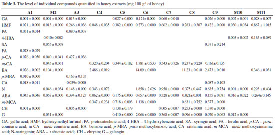 CONCLUSIONS The results indicate that of the three Brazilian honey types analyzed, "cambara" honey exhibited the highest content of phenolics and flavonoids, and also the highest antioxidant capacity. The antioxidant activity of the honey extracts studied in this work may be related to the antioxidant abilities of the phenolic acids and flavonoids that were identified. Analysis of the honey extracts by HPLC resulted in the identification of gallic, protocatechuic, 4-hydroxybenzoic, syringic, ferrulic, para-coumaric, meta-coumaric, benzoic, para-methoxybenzoic, cinnamic, and meta-methoxycinnamic acids and three flavonoids (naringenin, chrysin, and galangin) in all the samples tested. This study confirms that the profile of phenolic acids and flavonoids is affected by the floral origin of honeys to the point of contributing to their botanical and geographical differentiation. Preliminary measurements of phenolic compounds in honey extracts clearly demonstrate that a relationship exists between the concentration of individual phenolic compounds and antioxidant properties. PCA analysis appears to be a useful tool for differentiation of honey authenticity (in the sense of botanical origin of samples) using the phenolic compounds profile. The results obtained using PCA confirm that data on phenolic compounds data are suitable for differentiation of honey samples according to their type, making it possible to separate the samples into three groups. Thus, 4-hydroxybenzoic acid for "morrão de candeia" honeys and both meta-coumaric acid and meta-methoxycinnamic acid are suggested as potential biomarkers for "cambara" honeys.