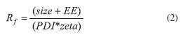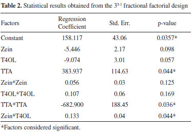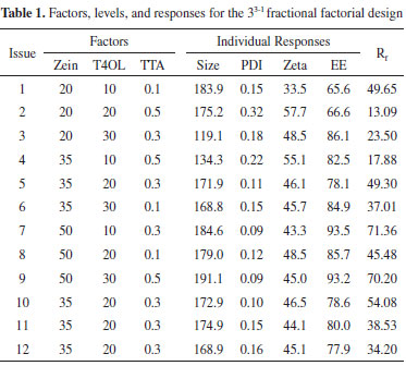To optimize the experimental conditions used to prepare NPs with encapsulated T4OL, a 33-1 fractional factorial design with quadruplicate samples at the central point was constructed with zein, T4OL, and TTA considered as factors and particle size, PDI, zeta potential, and EE considered as responses (Table 1). The interpretation of the results was simplified by considering a response function (Rf) simultaneously associated with the four responses through Equation 2, which was implemented to provide a higher response, i.e., Rf was fitted such that the highest value obtained represented the best global response of the system: