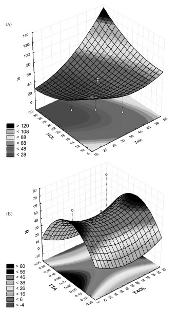 ![]() Figure 2. Response surfaces obtained for T4OL with (A) zein and (B) TTA