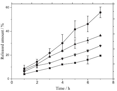 ![]() Figure 3. Release of T4OL from zein NPs in the absence (●) and presence of oleic acid (▲), limonene (▼), and propylene glycol (■)