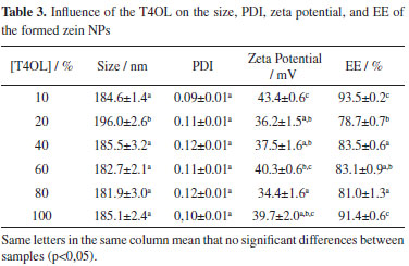 RESULTS AND DISCUSSION The zein NPs obtained had average diameters that ranged from 120 to 190 nm and polydispersity index (PDI) values between 0.09 and 0.32. NPs with T4OL encapsulated can be observed in Figure 1A and are in the form of dense spheres (with or without T4OL).
