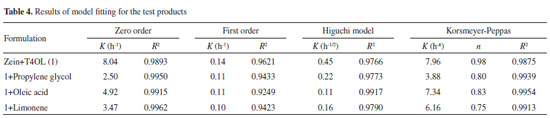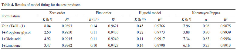 EXPERIMENTAL Materials Corn zein, T4OL, n-tetradecyl trimethyl ammonium bromide (TTA), R-(+)-limonene, oleic acid, and propylene glycol were obtained from Sigma-Aldrich. Ethanol was acquired from LAFAN, and acetonitrile was purchased from VETEC. All reagents were used as received. Phosphate-saline buffer (PBS) at pH 7.4 was used in the experiments. Preparation and physicochemical characterization of NPs Zein NPs were prepared using a modified antisolvent precipitation process (desolvation).23 In this process, the zein was initially dissolved in a binary solvent of ethanol/water (87:13) and T4OL and T4OL + SPE were subsequently added. The SPEs studied were R-(+)-limonene, propylene glycol, and oleic acid; these SPEs were added individually to the zein solutions, which were then mixed for 30 min. For each sample, 3 mL of zein solution containing T4OL was dropped at a constant rate of 6 mL h-1 into 9 mL of an aqueous solution containing the selected amount of TTA under magnetic stirring at 1000 rpm. The organic solvent was removed by evaporation under reduced pressure. The particle size and zeta potential of the freshly prepared NP dispersions were determined by photon correlation spectroscopy and laser-Doppler anemometry, respectively, using a Zetasizer Nano Series analyzer (Malvern Instruments, Worcestershire, UK). Morphological analysis of NPs was performed using transmission electron microscopy (TEM). To calculate the encapsulation efficiency (EE), we centrifuged the resulting suspensions at 4000 rpm for 30 min using an Amicon ultra-filter (a regenerated cellulose membrane with a molecular-weight cutoff of 100 kDa). The supernatants were removed, diluted in 87% ethanol, and analyzed for T4OL content by HPLC with UV/vis detection. An isocratic eluent consisting of acetonitrile:Milli-Q water (55:45) and a C18 column (XDB, 4.6 × 150 mm2, 5 µm, Agilent Zorbax Eclipse) were used; the flow rate was 1.3 mL min-1, the injection volume was 20 µL, and the detection wavelength was 200 nm. The EE was calculated on the basis of the difference between the amount of T4OL added to the zein solution and the amount present in the supernatant (not encapsulated). In vitro release In vitro release experiments were performed with samples containing 50 mg mL-1 of zein, 50 mg mL-1 of T4OL, and 0.3% of TTA. R-(+)-Limonene, propylene glycol, or oleic acid was added as the SPE to assess their influence on the T4OL release. In vitro release experiments (n = 3) with synthetic membranes (Spectra/Por® 3. 3500 g mol-1) were performed in glass Franz-type diffusion cells with a receptor volume of 10 mL and a diffusional area of 1.77 cm2. An isotonic PBS containing 1% (w/v) Tween 80 was included as the receptor medium, and the system was continuously stirred. The system was maintained at 37 ºC to mimic in vivo conditions. Predefined concentrations of each formulation were separately placed in the donor compartment (zein:T4OL; zein:T4OL:SPEs). At time intervals of 1, 2, 3, 4, 5, 6, and 7 h, 400 µL of each sample was removed from the receptor and immediately replaced with fresh PBS/Tween80 solution. The T4OL concentrations of the samples were determined by RP-HPLC. T4OL release kinetics To describe the drug release kinetics of the test formulations, zero-order (i.e., the amount of T4OL released per diffusion area vs. time), first-order (i.e., log of the amount of drug remaining to be released vs. time), Higuchi's (i.e., the amount of T4OL released per diffusional area vs. square root of time), and the Korsmeyer-Peppas theoretical models were used. The Korsmeyer-Peppas model24,25 is based on Equation 1: