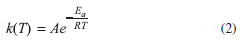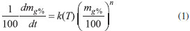 onde: mg%, é a massa percentual do vapor produzido pelo óleo essencial; n, é a ordem da reação; e, k(T), a constante de velocidade da reação, cuja dependência com a temperatura T é dada pela Equação de Arrhenius, representada na Equação 2.9