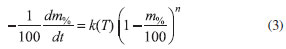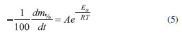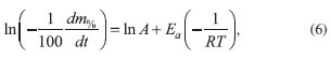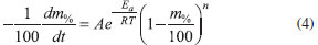Esta equação é válida para uma faixa limitada de temperatura dentro da qual a reação ocorre, sendo: A, uma constante chamada fator pré-exponencial; Ea, a energia de ativação da reação; T, a temperatura termodinâmica; e, R = 8,31447 × 10-3 kJ/(mol K), a constante do gás. A lei de velocidade (Equação 1) está escrita em termos da massa do vapor produzido pelo óleo essencial, no entanto, neste caso, a massa mg% monitorada pela TG deve ser a da amostra. A lei de velocidade pode ser reescrita em termos da massa da amostra, m%, conforme apresentado pela Equação 3.