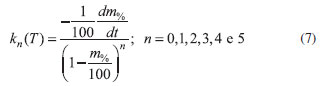 No intuito de se determinar a ordem da reação envolvida na técnica TG, construíram-se gráficos da constante de velocidade k versus T a partir da Equação 2, reapresentada com valores progressivos da constante n, para ordens de 0 a 5, na Equação 7 e Figura 7.