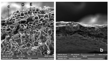 ![]() Figura 1. Imagens micrográficas, por SEM, correspondentes a: a) células secretoras das folhas da S. guianensis localizadas no mesófilo (500x); e b) sob ampliação de 329x, um dos ductos secretores com suas dimensões aproximadas