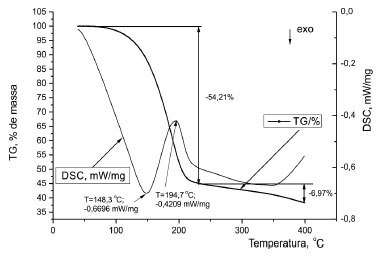 A composição química final, principalmente, com relação aos sesquiterpenos e dos compostos não terpênicos, está de acordo com o encontrado na literatura, para o mesmo material, porém, para locais de colheita diferentes, mas mesma época do ano.1 A variação da composição resultante é função da fenologia da espécie e das variações meteorológicas.1 TG/DSC A curva TG do óleo essencial S. guianensis (Figura 4), em atmosfera de N2, mostrou decomposição gradativa acentuada entre 100 ºC e 225 ºC com uma perda de massa equivalente a 54,21% do total da amostra. A partir desta temperatura, a perda de massa foi de 6,97%, até próximo de 400 ºC.