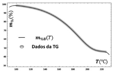 ![]() Figura 5. Ajuste matemático ou "fitting" com polinômio de grau 8, de um trecho da curva TG, regressão linear a partir de um polinômio de grau 8 no intervalo de temperatura de 90-230 ºC, faixa de temperatura que contém a primeira fase de perda de 54,3% de massa