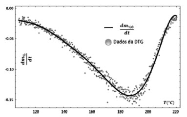 ![]() Figura 6. Ajuste ou "fitting" dos dados da DTG a partir do polinômio m%8 (T)